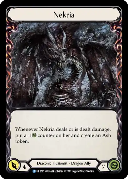 . Nekria vytvoří popel a při udělení poškození si přidá počítadlo -1 HP. Burn Them All říká, že první drak, který zaútočí v každém kole, udělí 1 Arcane Damage. Nekria tedy získá tuto schopnost, udělí Arcane Damage a poté vytvoří popel. Pěkný způsob, jak získat hodnotu navíc, ale Nekria se velmi rychle zmenší. Pokud si při útoku dá sedmý mínusový žeton, pak bohužel opět přijde o Go Again a řetězec pravděpodobně skončí.
