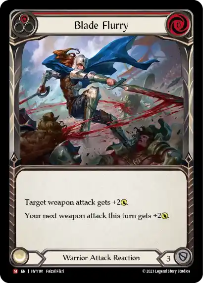 , které tyto dvojité útoky umožňují a dávají zbraním Go Again. Vysoké zastoupení dále tvoří útočné reakce, které umožňují prosadit onhit efekty, například Blade Flurry