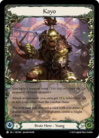První z těchto schopností říká, že Attack Action karty mimo combat chain získávají +1 ATK. Tento bonus sice neovlivní přímo zranění udílené soupeři, ale usnadní interakce kartám, které se zajímají o sílu zahozených karet z ruky. Takové interakce se většinou ptají na zahozené karty o síle 6 ATK. Pokud Kayo zahodí kartu se silou 5 ATK, svojí schopností je navýší na 6 ATK, a podmínku interakce tak splní.