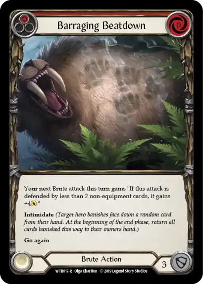 Intimidate spustíme tak, že během své akční fáze zahodíme útok se silou 6 nebo více díky Rhinarově schopnosti, nebo zahrajeme některou z mnoha karet, na které je Intimidate natisknut. Tato schopnost do konce kola banishne náhodnou kartu z oponentovy ruky a tím limituje jeho schopnost bránění. Intimidate tudíž exceluje vůči hrdinům, kteří se snaží více blokovat, jako například Guardiani. Vzhledem k tomu, že Intimidate banishuje náhodnou kartu, může pro oponenta vzniknout nepříjemná situace, kdy je přinucen blokovat silnějšími kartami, které měl v plánu ve svém kole hrát. Také máme možnost zřetězit několik Intimidatů za sebou a tím udělat naše útoky prakticky neblokovatelné.