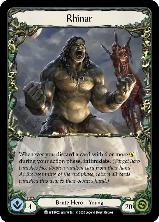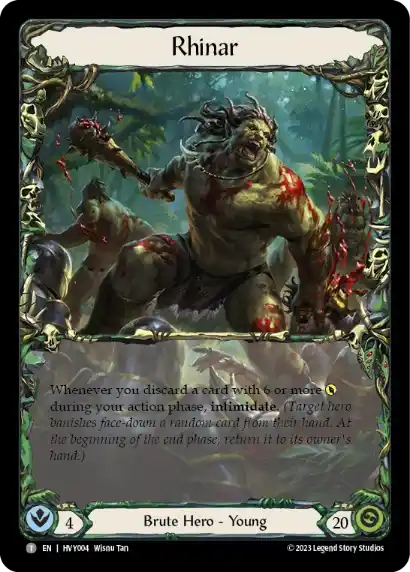 Rhinar patří mezi první čtyři hrdiny, kteří vyšli v sadě Welcome to Rathe. Jeho hlavní náplní je sestavit obrovské útoky a znepříjemnit oponentovi jejich blokování skrz jeho klíčovou schopnost – Intimidate.